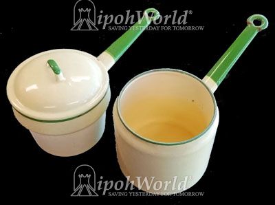 The pictures show a yellow enamel 2-tier pot. The top half is where the food is kept, while the bottom half is filled with hot/boiling water. This usually keeps the food warm.