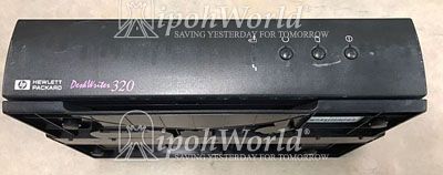 The pictures show a Hewlett-Packard (HP) DeskJet 320 legacy printer. The top panel (first picture) shows the instructions for setting up the paper.